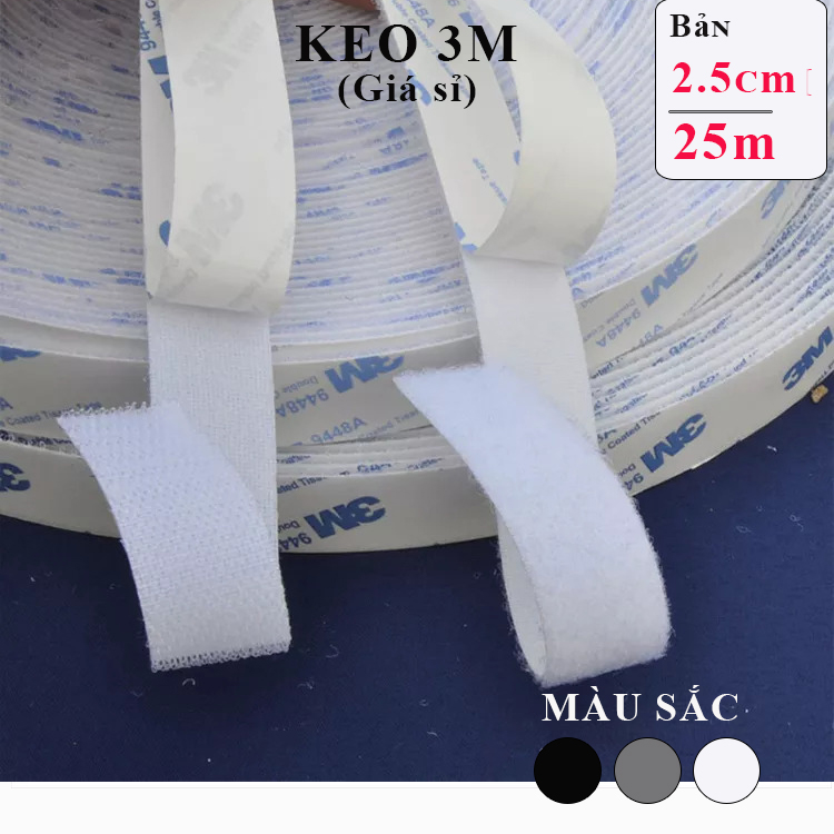 Khóa nhám có keo 3M bản 2.5cm, velcro tape/ miếng dán gai 3M đen, xám, trắng